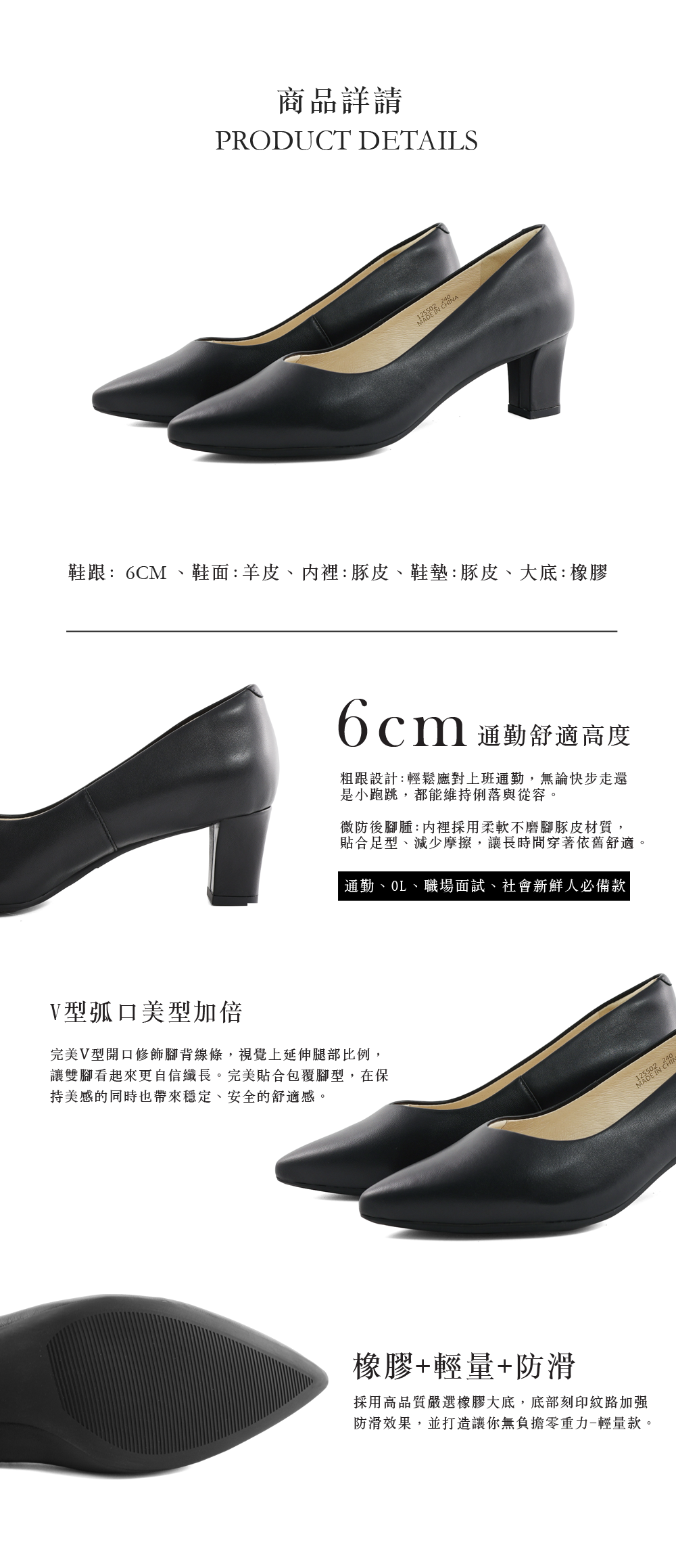 【通勤族、職場女性一致推薦──舒適與修長的必備高跟鞋】 頂級柔軟羊皮,觸感細緻服貼;內裡以透氣豚皮打造,長時間穿著依舊乾爽舒適,三層舒適鞋墊結合豚皮、高密度乳膠、科技海綿與3D立體記憶腳窩墊,久站久走依然零負擔,6公分高度輕鬆應對上班通勤,無論快走還是小跑跳。都能維持俐落與從容;V型開口修飾腳背線條,視覺完美延伸腿部比例。