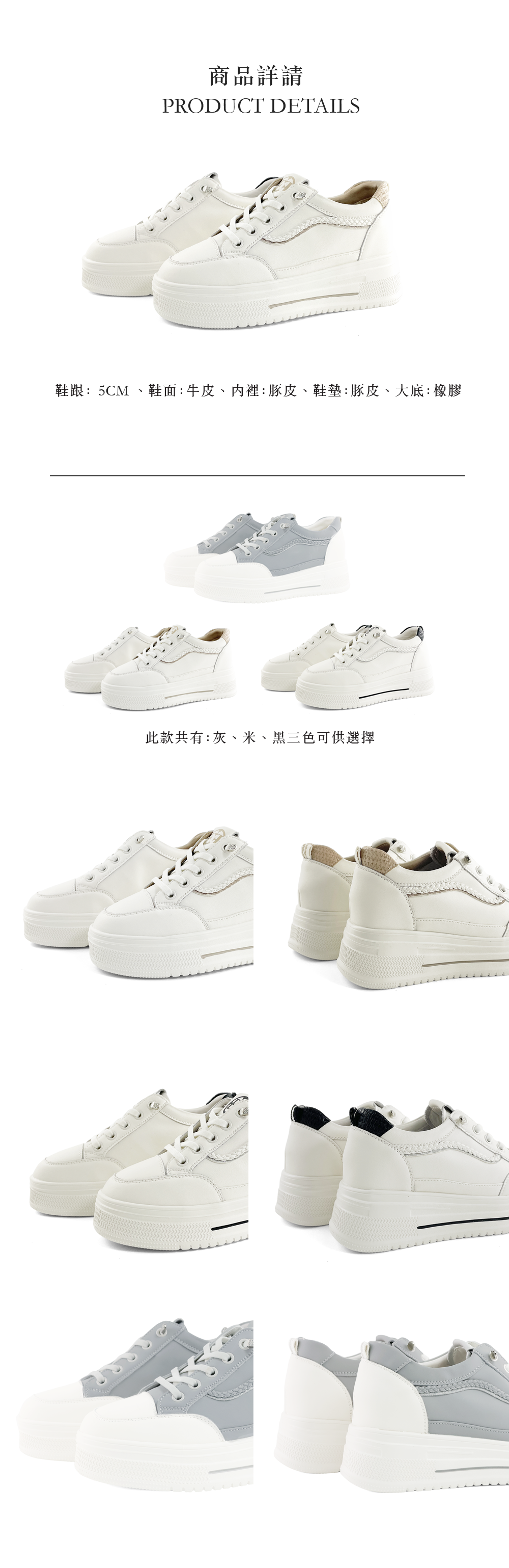 柔軟牛皮編織點綴拼接輕量雙色增高基本百搭休閒鞋(灰) (米)(黑) 125833