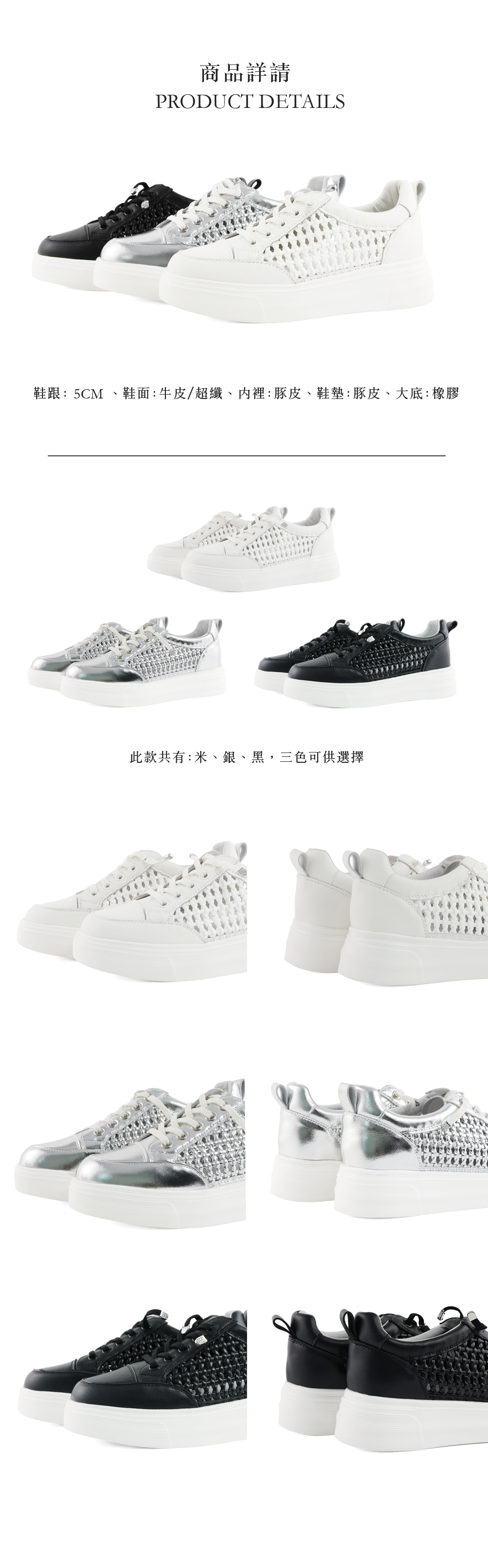 縷空編織拼接牛皮百搭厚底輕量免綁帶休閒鞋(米)(銀)(黑) 126354