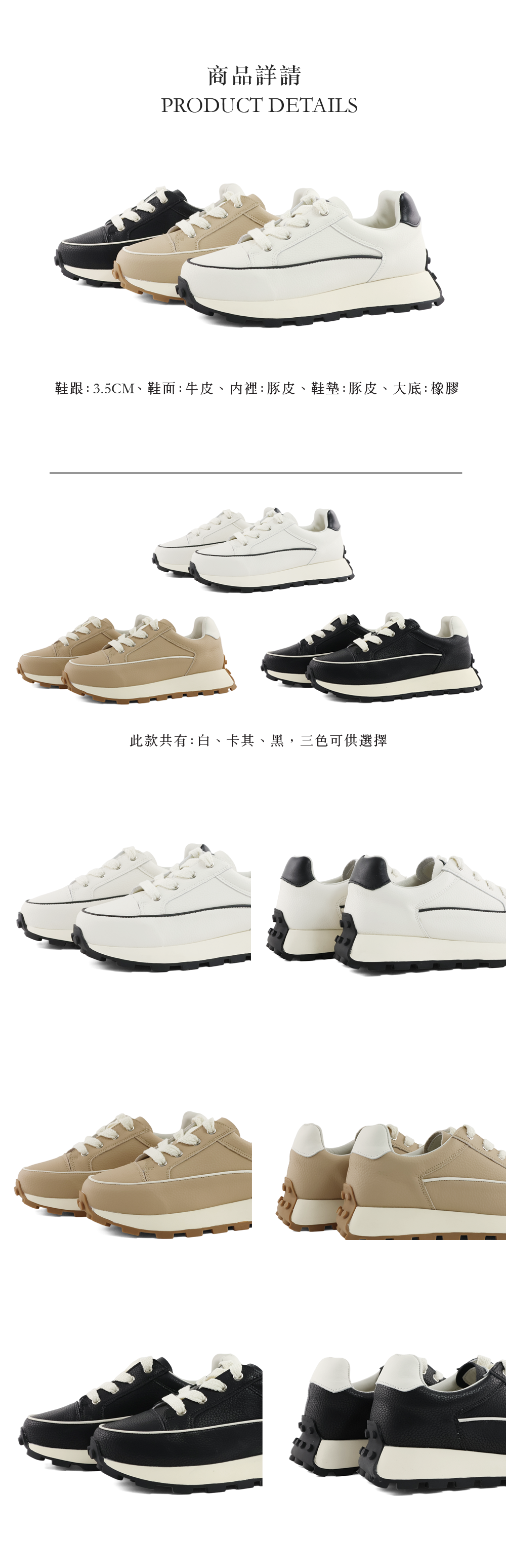 【甜美與率性,一鞋完美演繹】 復刻經典跑鞋造型,基本百搭低調配色滾邊裝飾,讓妳無論日常生活都閃耀聚焦。內裡、鞋墊採用精選羊皮,柔軟透氣不悶熱;粗顆粒止滑大底穩固抓地,時尚與機能兼具,展現自信步伐。
