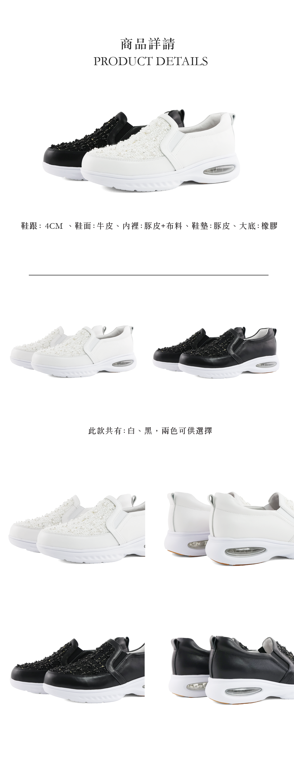 【輕量厚底與經典小香風的完美邂逅】 質感牛皮打造鞋身,搭配細緻的小香風粗花呢織紋,並手工點綴璀璨珠飾與亮片。不論是日常穿搭還是出席場合,都能散發內斂而迷人的名媛氣息。 採用豚皮內裡與豚皮鞋墊,結合高透氣布料,觸感柔軟且吸濕排汗。即便不穿襪子也能享受絕佳的親膚感,讓雙腳整天保持乾爽不悶熱。 氣墊減震大底與防滑橡膠支撐,能有效吸收行走時的地面衝擊力。獨特的輕量化設計與後跟增高弧度,不僅修飾腿部線條,更讓你久站久走也不易疲累。
