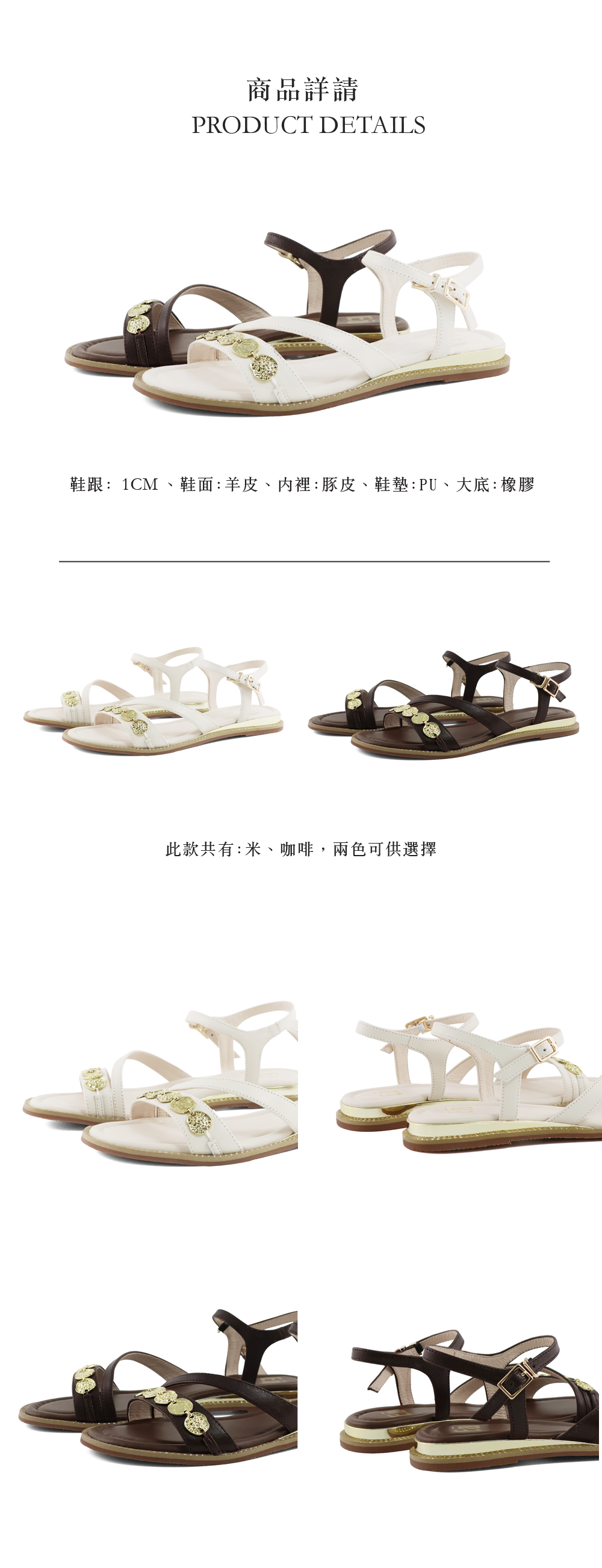 復古雕花金幣優雅羊皮細版低跟舒適平底涼鞋(米)(咖啡) 126443